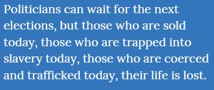 Politicians can wait for the next elections, but those who are sold today, those who are trapped into slavery today, those who are coerced and trafficked today, their life is lost. Their humanity is lost, their future is lost, and they cannot wait. So, we should have a strong sense of urgency to pass this effective Bill.