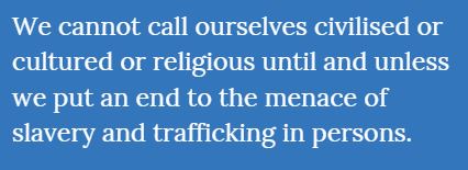 We cannot call ourselves civilised or cultured or religious until and unless we put an end to the menace of slavery and trafficking in persons. We have to be vigilant around us and must have the courage to speak out. We should raise our voice. We must demand for stringent laws and their speedy, effective implementation.
