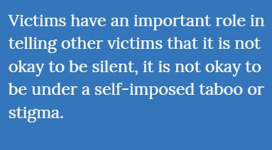 So the centre piece for any action in India, to really galvanize and move forward at a faster pace to make up for all the lost years, is to get the victims involved in this dialogue. This is to create urgency, a sense of responsibility within the police, prosecution and the judiciary. I believe the victims have an important role in telling other victims that it is not okay to be silent, it is not okay to be under a self-imposed taboo or stigma. It is not a stigma, it is a crime and it is obligatory on the part of the families to go out and do the right thing.