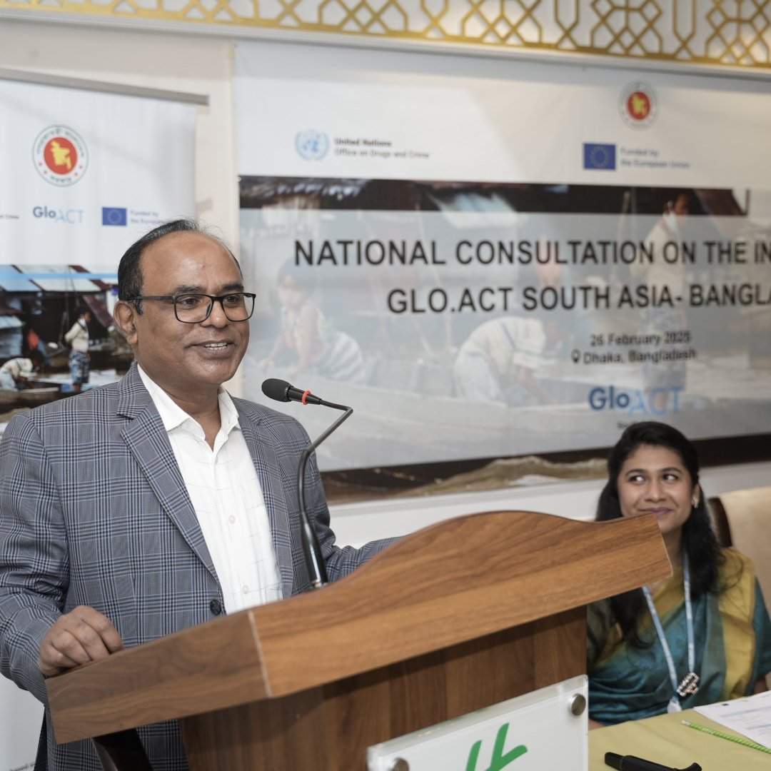 Recognizing the need for a comprehensive and coordinated approach, UNODC, in partnership with the European Union (EU), has launched the "Preventing and Addressing Trafficking in Human Beings and the Smuggling of Migrants in South Asia" initiative. As part of this critical effort, a National Consultation on the Inception of GLO.ACT South Asia was organized in Dhaka with the Ministry of Home Affairs, bringing together 32 stakeholders, including representatives from key ministries, law enforcement agencies, UN bodies and civil society organizations.